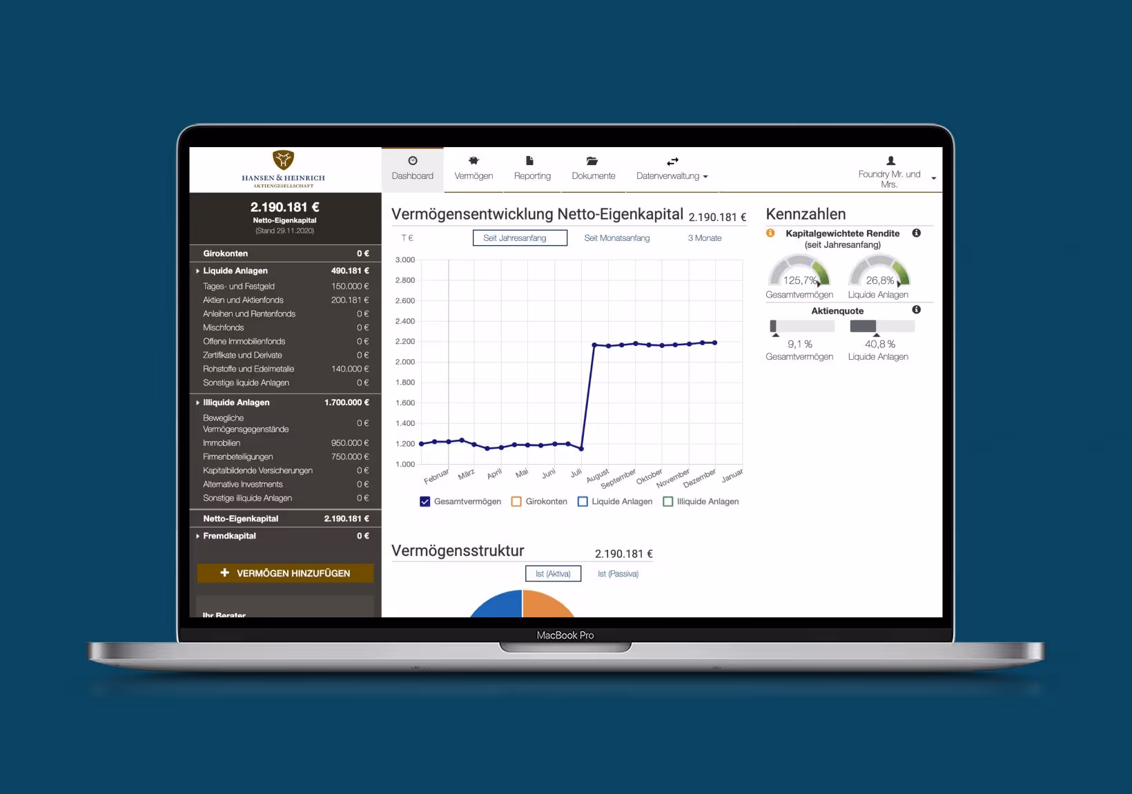 Unsere Vermögenssoftware lässt Sie alle liquiden und illiquiden Vermögenswerte auf Knopfdruck steuern und planen. Ein unverzichtbares Instrument für ein modernes und ganzheitliches Vermögensmanagement. Probieren Sie es aus.